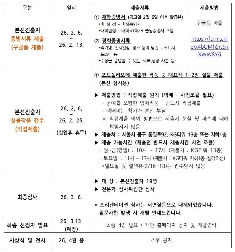 - 증빙서류 제출 : 구글폼제출 (https://forms.gle/x4bQMhSrsSnXWW8Y6)- 실물작품 제출 : 직접제출 (택배제출 시 사전조율 필요) *공예 등 입체작품은 반드시 직접제출